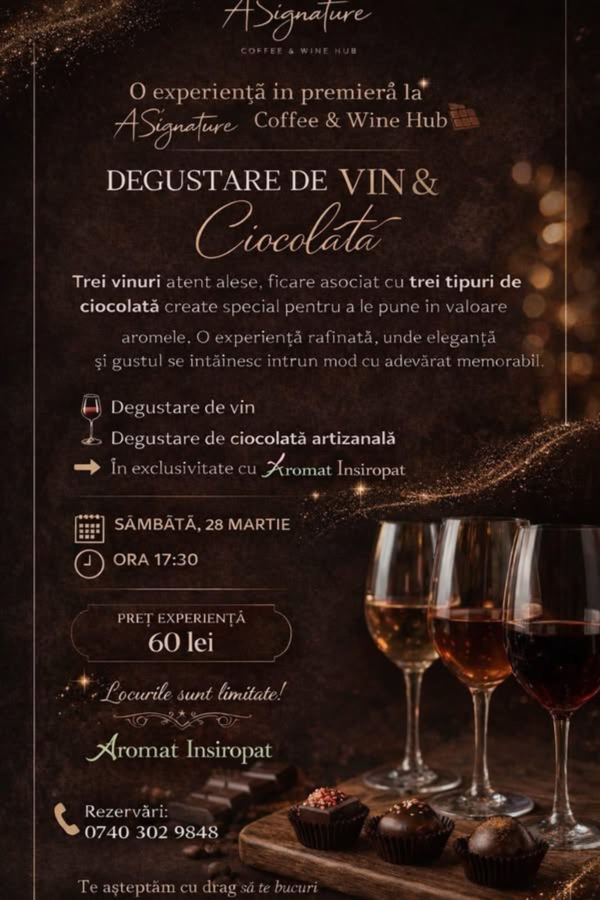 3 vinuri atent alese 3 tipuri de ciocolata create special pentru ele Asocieri gandite ca sa le simti, nu doar sa le gusti ASignature Coffee & Wine Hub